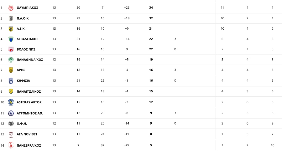 «Πρωταθλητής χειμώνα» ο Ολυμπιακός, ουραγός ο Πανσερραϊκός