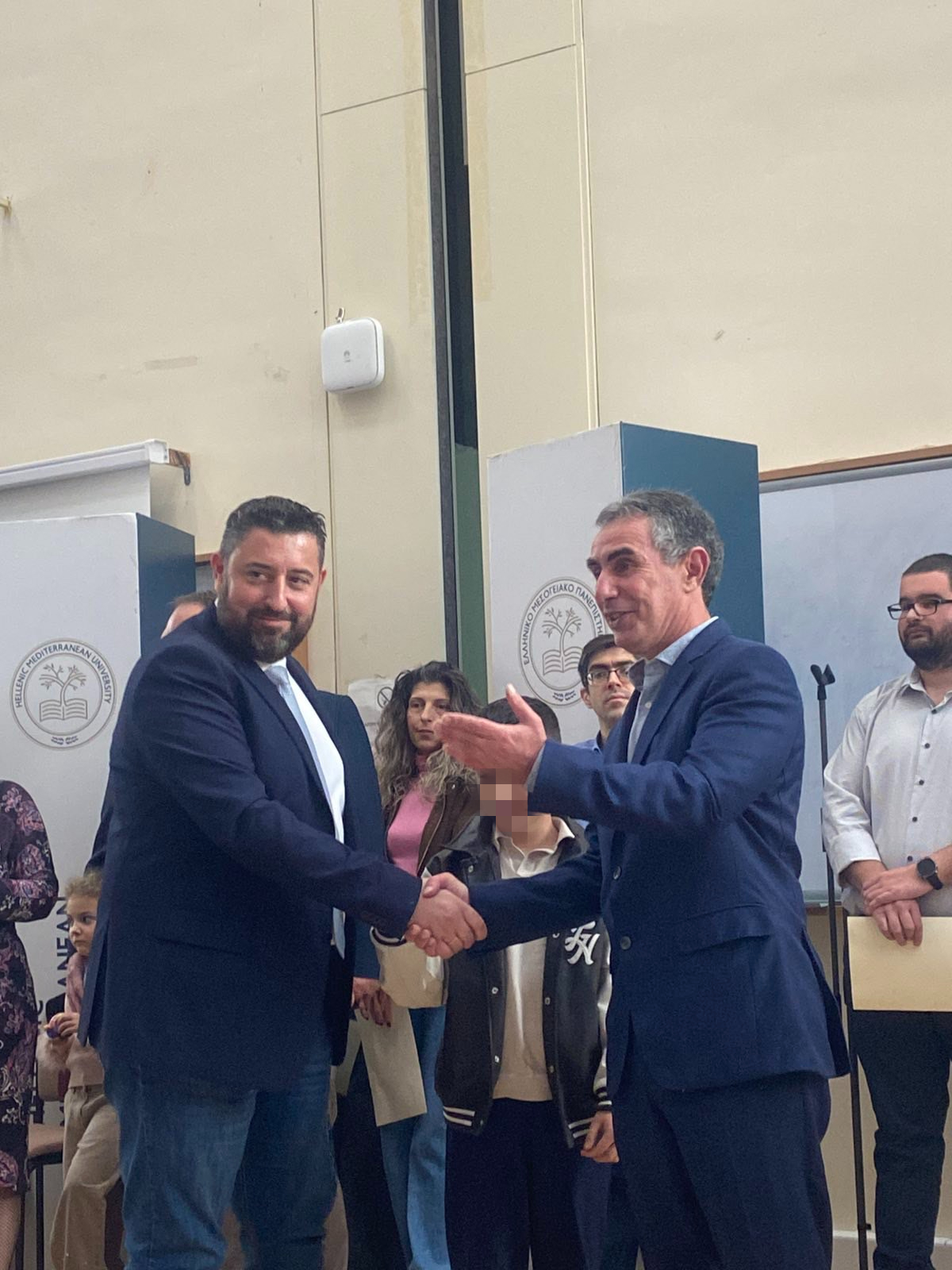 Σε μια ζεστή τελετή, παρουσία συναδέλφων, φίλων και της οικογένειάς του, ο ίδιος δεν έκρυβε τη χαρά του για την ολοκλήρωση μιας μακράς και απαιτητικής προσπάθειας. Την απονομή πραγματοποίησε ο πρύτανης του ΕΛΜΕΠΑ, Νίκος Κατσαράκης, με το κλίμα να είναι ιδιαίτερα συγκινητικό.