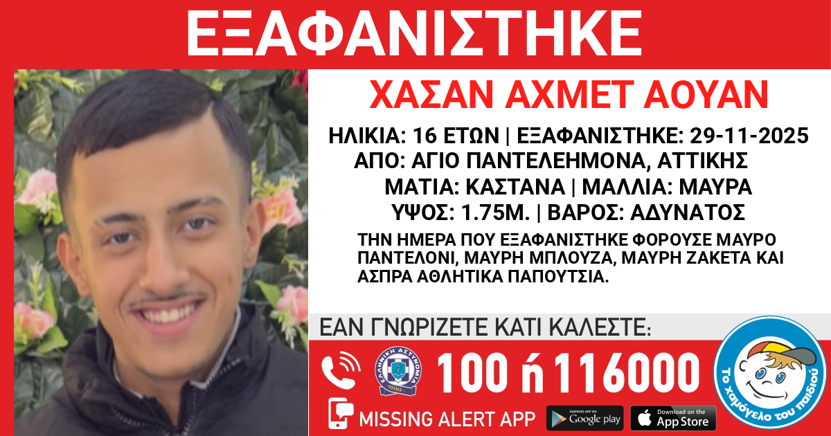 Κινητοποίηση των Αρχών, έπειτα από ειδοποίηση του «Χαμόγελου του Παιδιού» ότι το Σάββατο (29/11) και ώρα 12:15, εξαφανίστηκε από τον Άγιο Παντελεήμονα Αττικής, ο Αουάν Χασάν Αχμέτ, 16 ετών.