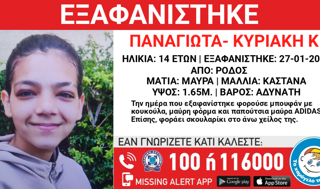 Σύμφωνα με το «Χαμόγελο του Παιδιού» την Τρίτη 27 Ιανουαρίου 2026, στις 11:00, η Παναγιώτα-Κυριακή Κ., 14 ετών, εξαφανίστηκε από χώρο παιδικής προστασίας στη Ρόδο. Η 14χρονη έχει ύψος 1,65 μ., αδύνατη σωματική διάπλαση, καστανά μαλλιά και μαύρα μάτια. Την ημέρα της εξαφάνισης φορούσε μπουφάν με κουκούλα, μαύρη φόρμα και μαύρα παπούτσια Adidas και φορούσε σκουλαρίκι στο άνω χείλος.