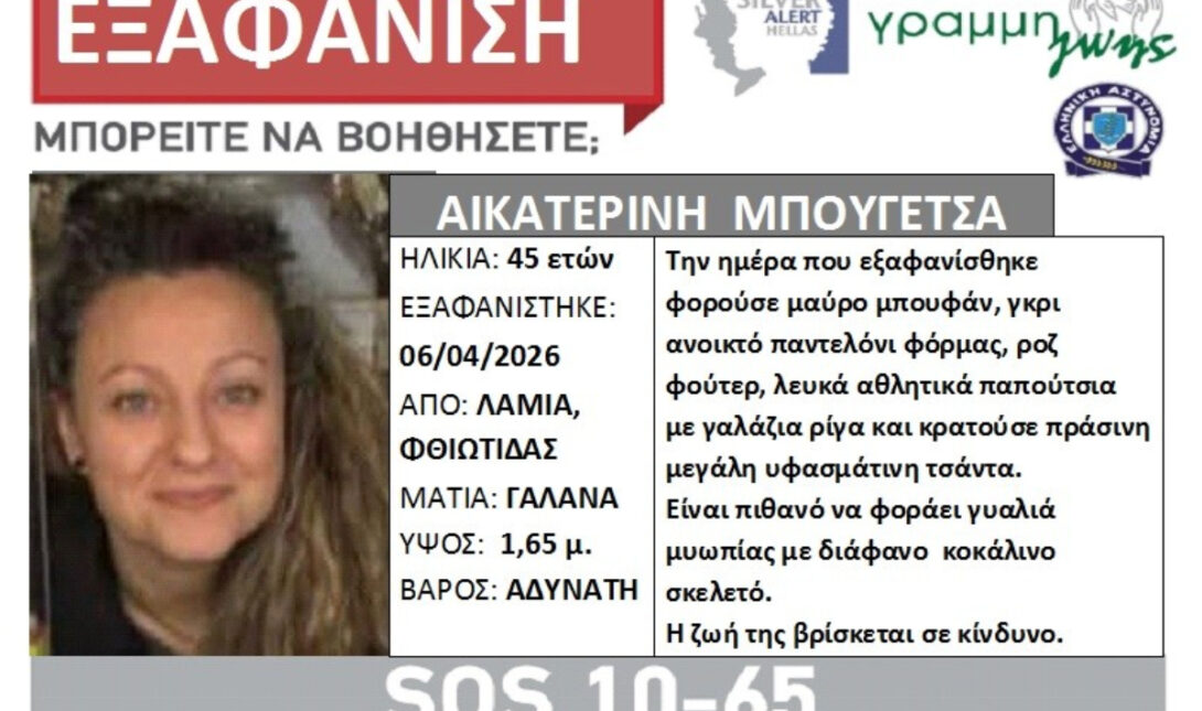- Η 45χρονη Κατερίνα Μπουγέτσα εξαφανίστηκε από τη Λαμία στις 06/04/26.