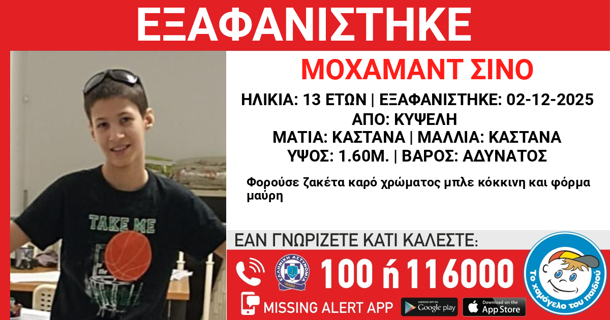Το «Χαμόγελο του Παιδιού» ενημερώθηκε για την εξαφάνιση του Μοχαμάντ Σινό σήμερα 02/12/25 και άμεσα προχώρησε στην δημοσιοποίηση των στοιχείων του, καθώς ενδεχομένως να συντρέχουν λόγοι που θέτουν την ζωή του σε κίνδυνο.