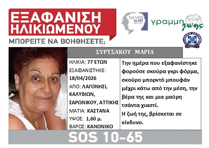 - Η 77χρονη Μαρία Συρτσάκου εξαφανίστηκε στο Λαγονήσι στις 18/04/26 και αγνοείται από τότε.