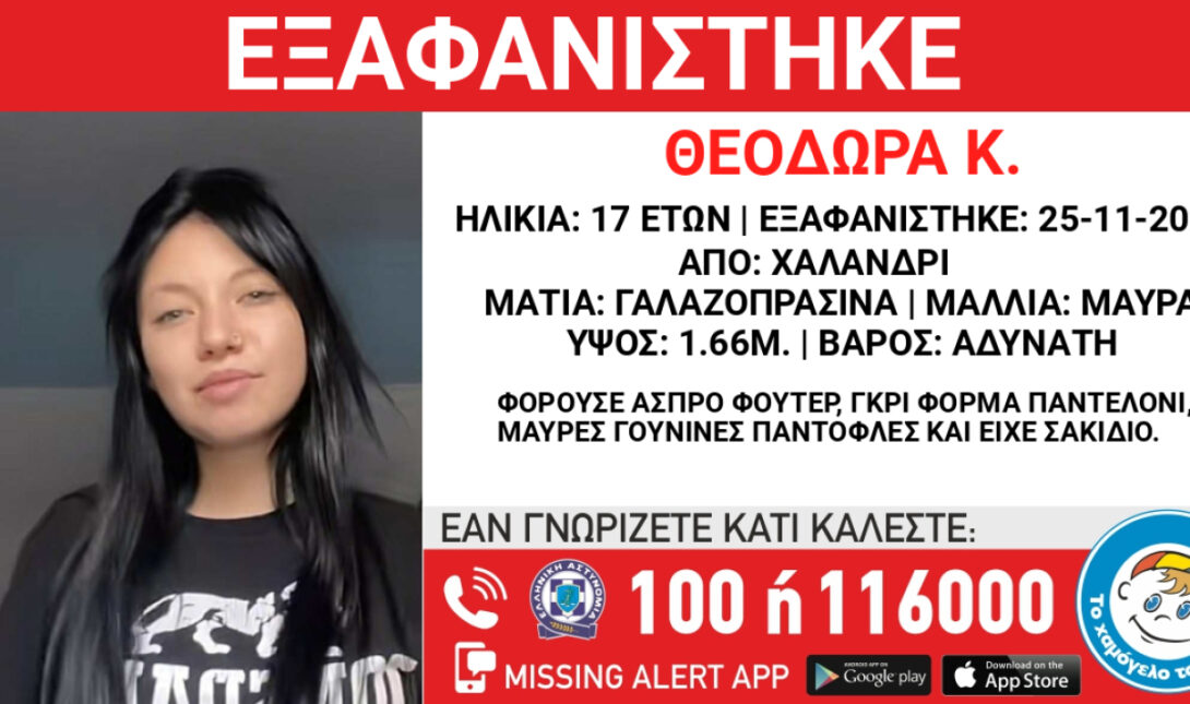 Ανησυχία προκαλεί η εξαφάνιση μιας 17χρονης από το Χαλάνδρι, με το «Χαμόγελο του Παιδιού» να ενεργοποιεί τον μηχανισμό αναζήτησης και να δημοσιοποιεί άμεσα τα στοιχεία της, κατόπιν αιτήματος της οικογένειας. Οι πληροφορίες που έχουν στη διάθεσή τους οι αρχές αφήνουν ανοιχτό το ενδεχόμενο η ανήλικη να βρίσκεται σε κίνδυνο, γεγονός που καθιστά κρίσιμες τις πρώτες ώρες των ερευνών.