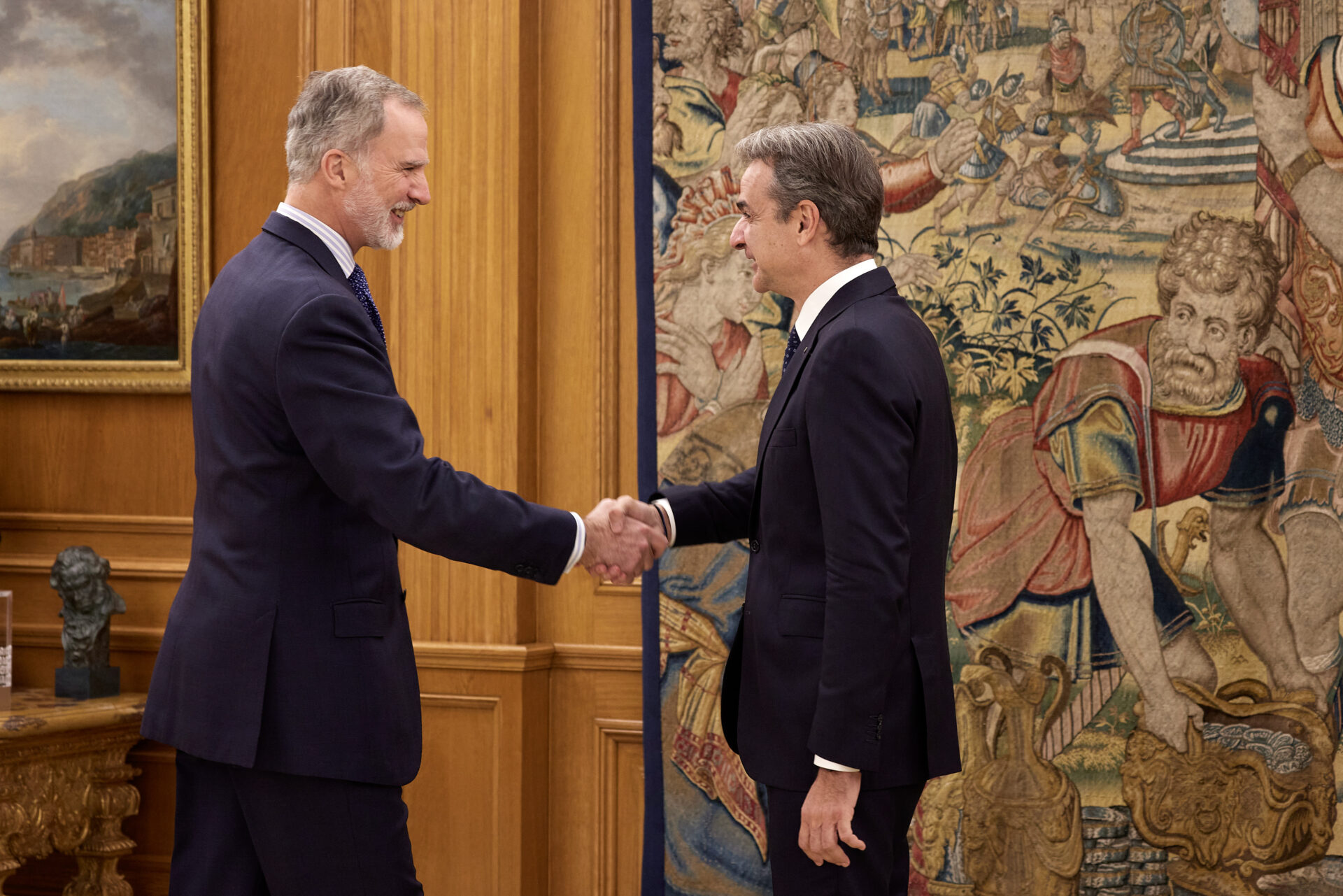 Ο Κυρ. Μητσοτάκης συναντήθηκε με τον βασιλιά της Ισπανίας, Φελίπε ΣΤ΄, στα βασιλικά ανάκτορα, συνοδευόμενος από την ελληνική αντιπροσωπεία.
