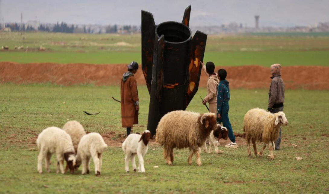 Θα μπορούσε να είναι αφίσα αντιπολεμικής ταινίας, κι όμως είναι πραγματικότητα. Παιδιά που βόσκουν πρόβατα στην ανατολική Συρία βλέπουν με δέος έναν πύραυλο που έχει καρφωθεί σε λιβάδι.