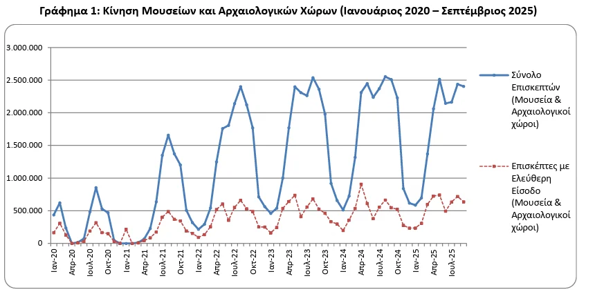 Το 9μηνο Ιανουαρίου- Σεπτεμβρίου 2025, σε σχέση με την αντίστοιχη περίοδο του 2024, παρατηρείται μείωση κατά 0,7% στους επισκέπτες των μουσείων, αύξηση κατά 9,3% στους επισκέπτες ελεύθερης εισόδου και κατά 34,8% στις εισπράξεις.