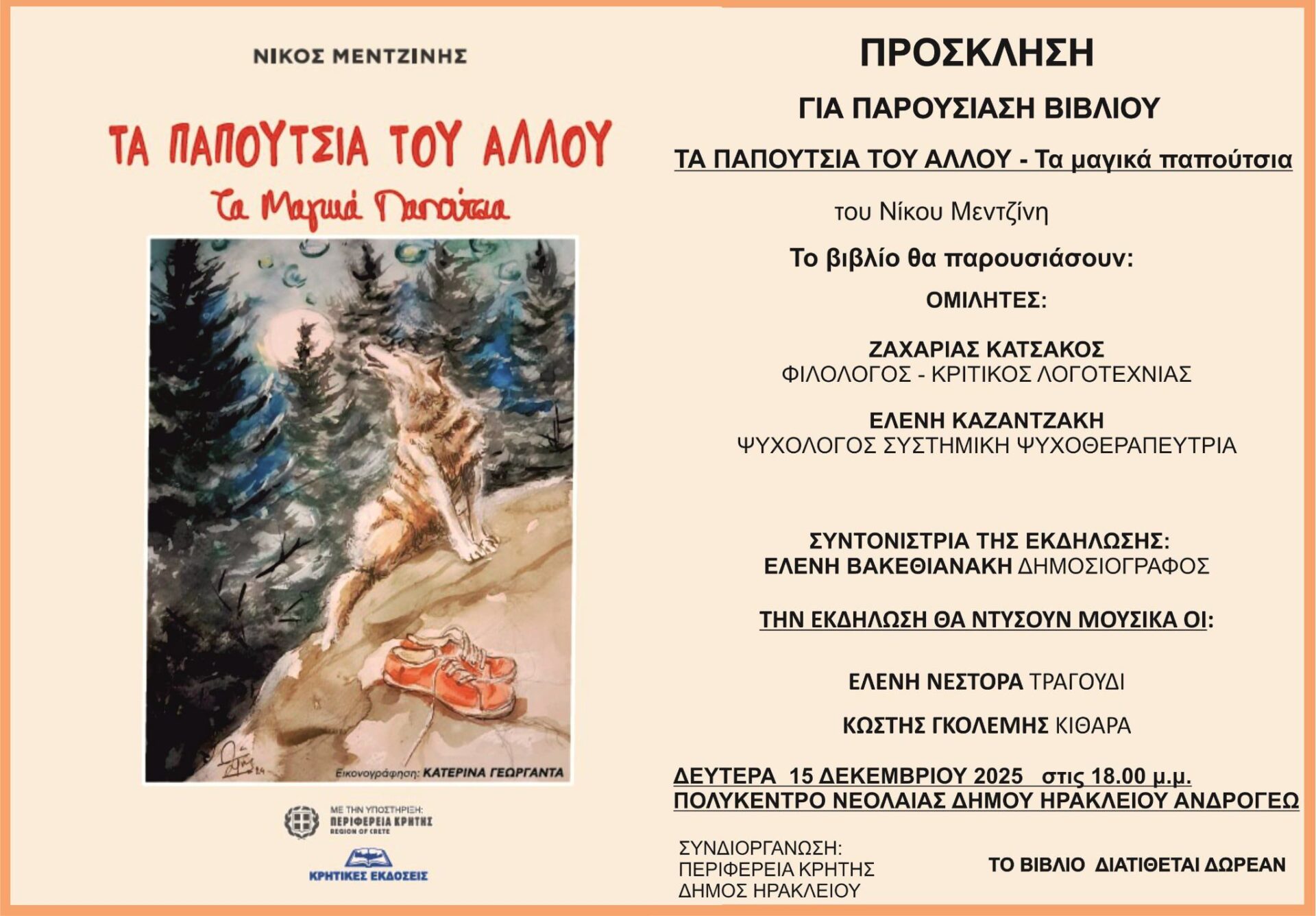 Η Περιφέρεια Κρήτης και ο Δήμος Ηρακλείου, σε συνεργασία με τις Κρητικές Εκδόσεις, προσκαλούν το κοινό στην παρουσίαση του νέου βιβλίου του Νίκου Μεντζίνη με τίτλο «Τα Παπούτσια του Άλλου – Τα μαγικά παπούτσια».