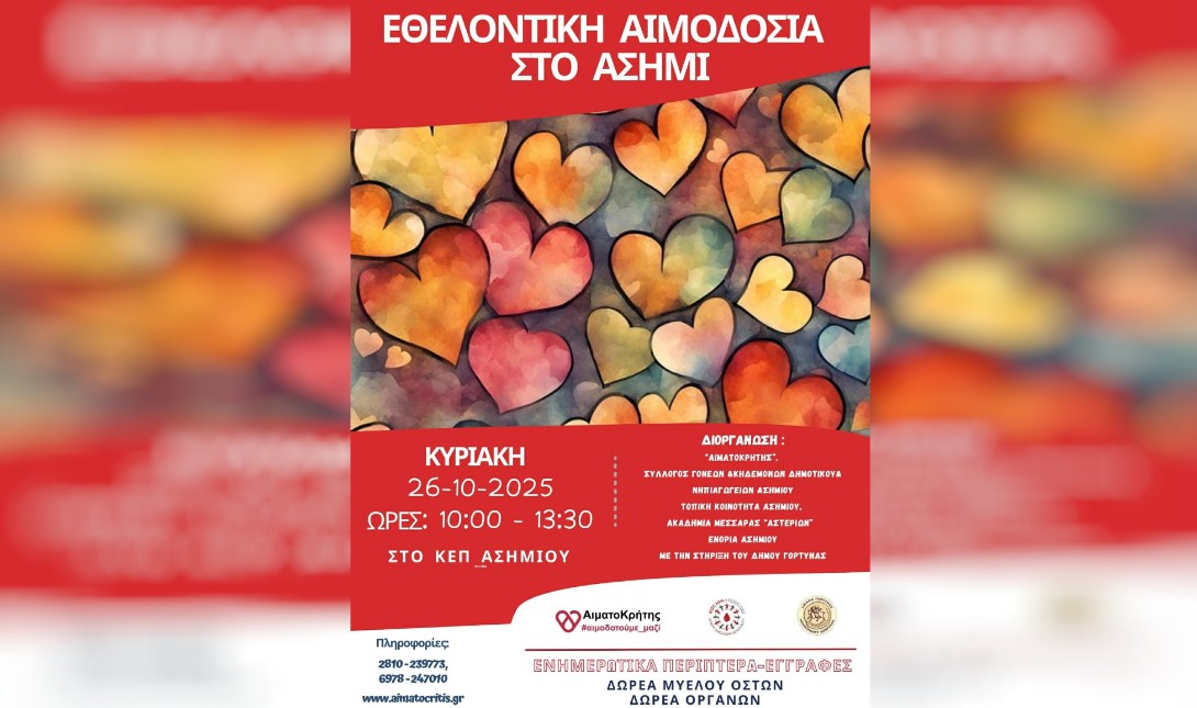 18.11.2025, 12:08 Ηράκλειο: 70ή Εθελοντική Αιμοδοσία της “Παρέας της Αγάπης”Ώρες 16:30 έως 20:30, στον Άγιο Ιωάννη Χωστό