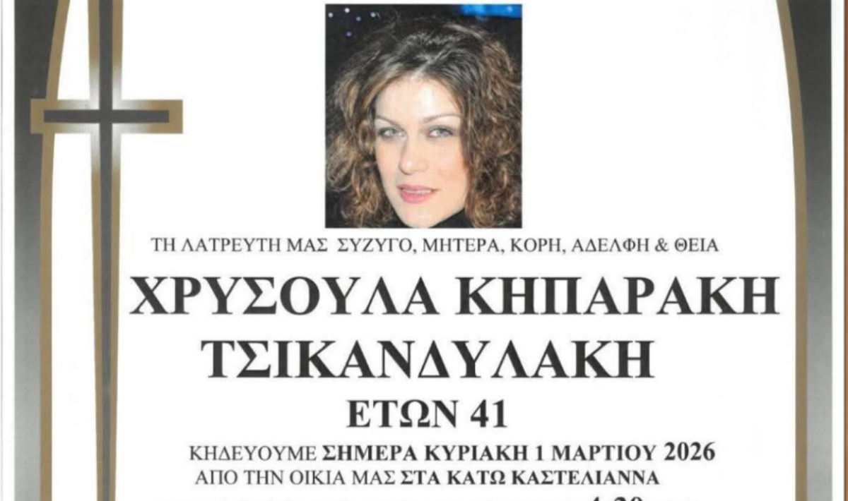 01.03.2026, 15:10 Θρήνος στο Ηράκλειο: Το τελευταίο «αντίο» στην Χρυσούλα που έφυγε από τη ζωή μόλις στα 41 της χρόνια!