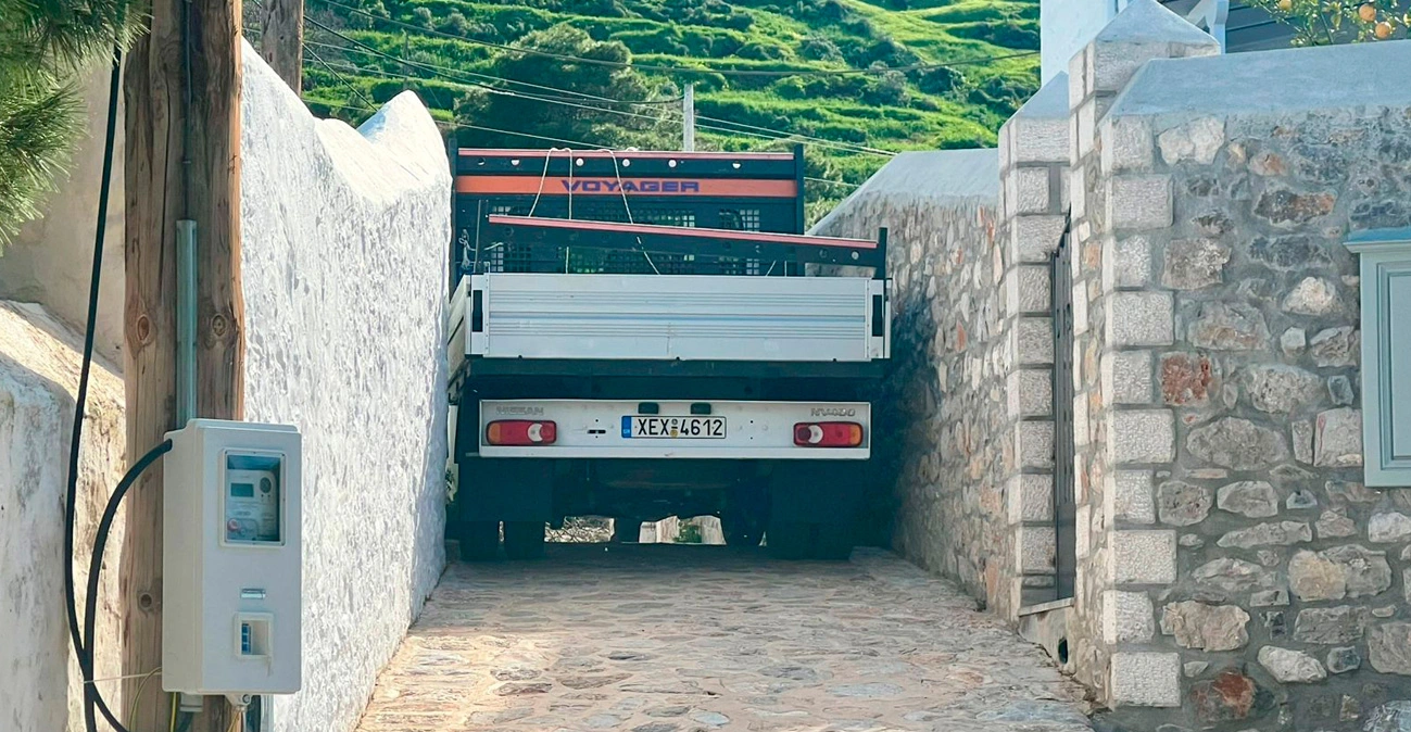Οχήματα που μεταφέρουν εξοπλισμό για την παραγωγή κινούνται με δυσκολία στα καλντερίμια του νησιού