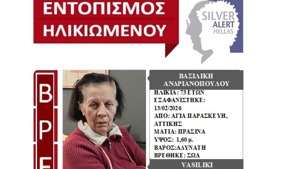 15.02.2026, 18:12 Η αναζητούμενη εντοπίστηκε περιπλανώμενη – Επέστρεψε σώα στην οικογένειά τηςΗ υμμετοχή όλων, βοηθά να βρεθεί κάθε άτομο που βρίσκονται σε κίνδυνο