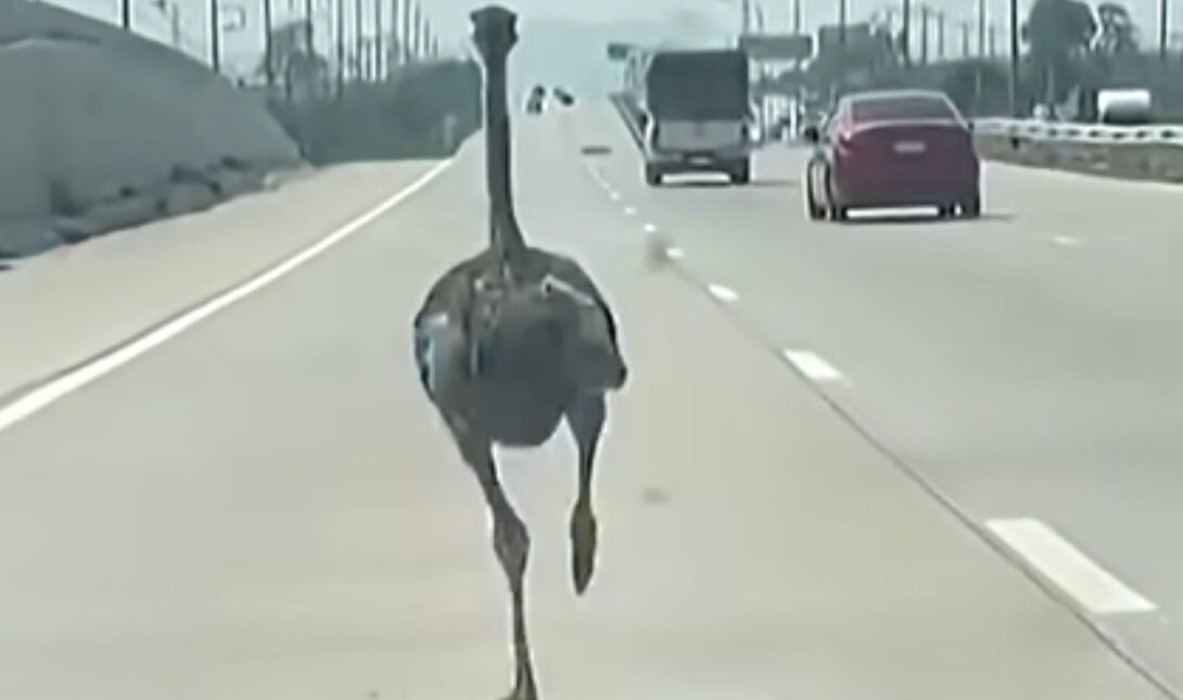 Το αρσενικό πτηνό κατεγράφη σε βίντεο να τρέχει με μεγάλη ταχύτητα σε αυτοκινητόδρομο στην παράκτια επαρχία Τσονμπούρι της Ταϊλάνδης, ενώ, αυτοκίνητα και φορτηγά περνούσαν δίπλα του και ένας οδηγός το ακολουθούσε σε κοντινή απόσταση.