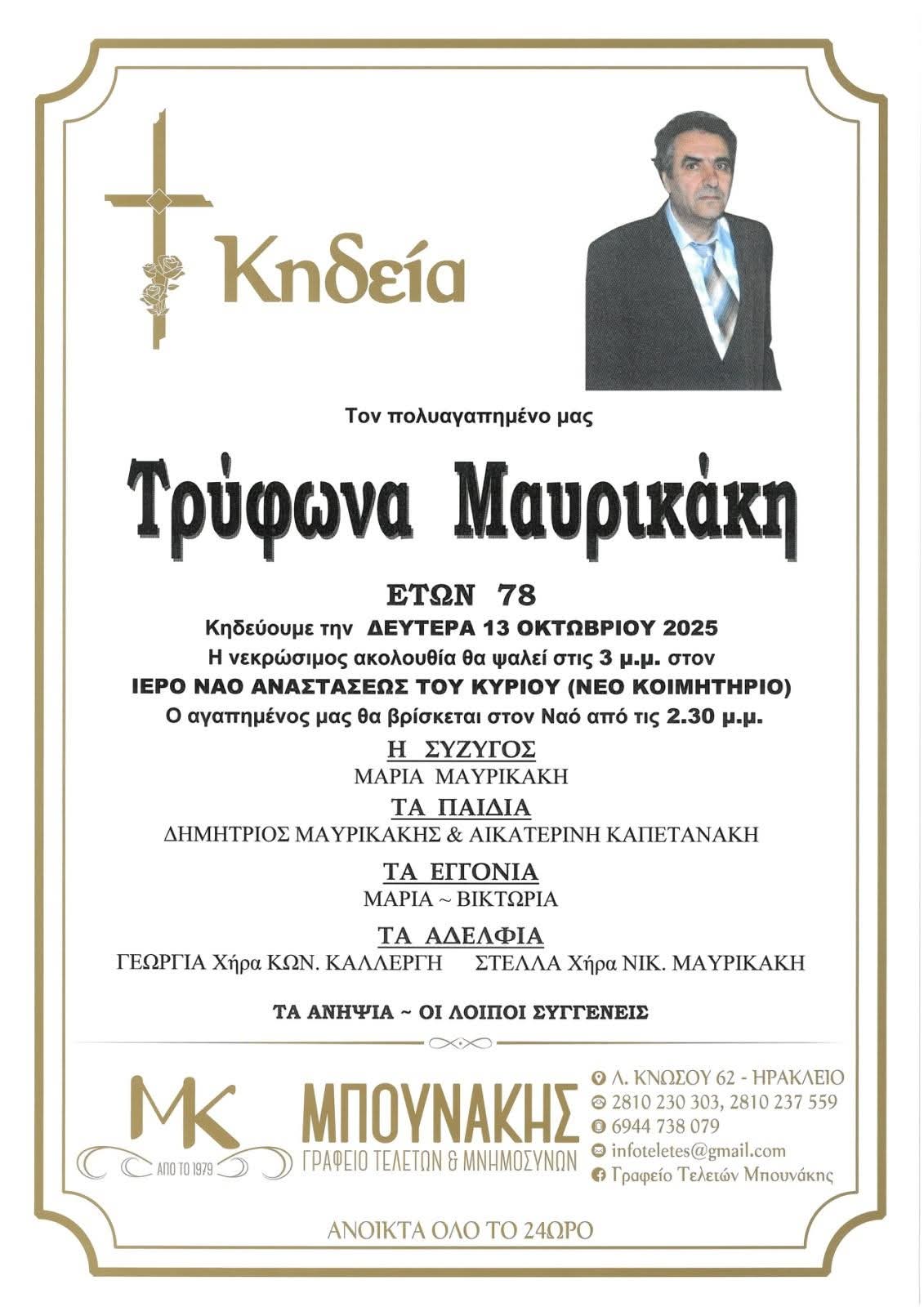 - Βαθιά θλίψη προκάλεσε στον επιχειρηματικό και εμπορικό κόσμο του Ηρακλείου ο θάνατος του Τρύφωνα Μαυρικάκη.