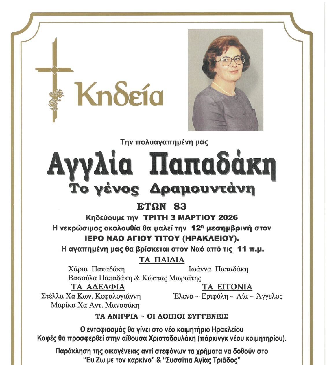 Η κηδεία θα τελεστεί την Τετάρτη 3 Μαρτίου, στον Ιερό Ναό Αγίου Τίτου, στις 12:00.