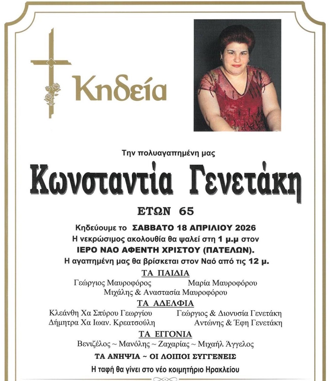 Η κηδεία της θα γίνει το Σάββατο 18/4 στη 1 μ.μ., στον ιερό ναό Αφέντη Χριστού στις Πατέλες, ενώ η ταφή της θα γίνει στο νέο κοιμητήριο Ηρακλείου.