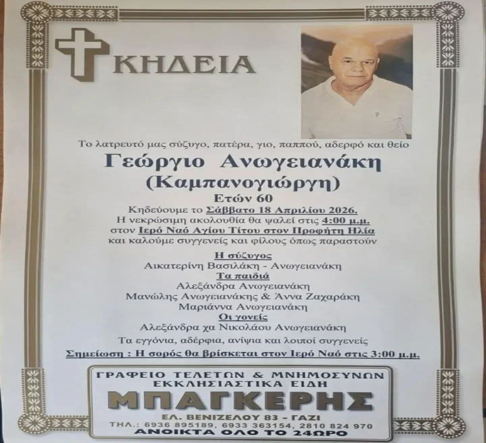 Η είδηση του θανάτου του Γιώργου Ανωγειανάκη έχει προκαλέσει βαθιά θλίψη σε συγγενείς, φίλους και συγχωριανούς, καθώς έφυγε από τη ζωή σε ηλικία μόλις 60 ετών.