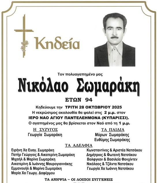 Τα θερμά τους συλλυπητήρια προς το ιδρυτικό μέλος και μαραθωνοδρόμο του συλλόγου, Μύρωνα Σωμαράκη, εκφράζουν το Διοικητικό Συμβούλιο, οι προπονητές, τα μέλη και οι αθλητές του Συλλόγου Μαραθωνοδρόμων Κρήτης «Ίκαρος», για την απώλεια του αγαπημένου του πατέρα, Νικολάου.