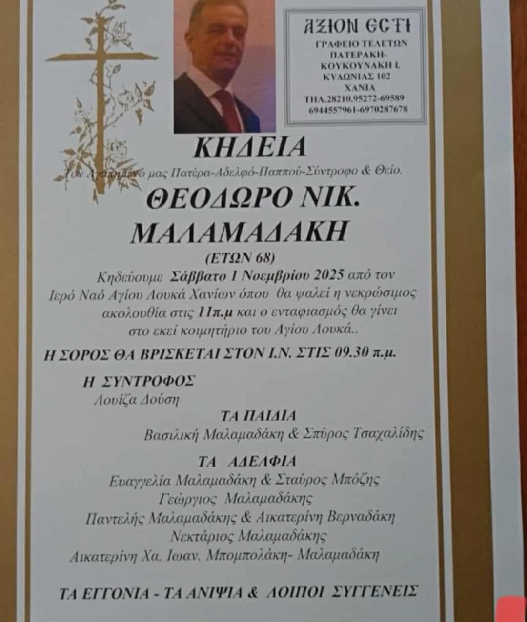 Η κηδεία του θα τελεστεί το Σάββατο 1 Νοεμβρίου 2025, στον Ιερό Ναό Αγίου Λουκά στα Χανιά, στις 11:00 π.μ.