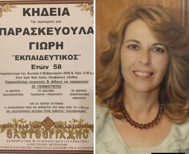 • Η Παρασκευούλα Γιώρη, εκπαιδευτικός στο Δημοτικό Σχολείο Πετεινού, απεβίωσε πρόωρα σε ηλικία 58 ετών, προκαλώντας θλίψη στην Ξάνθη.