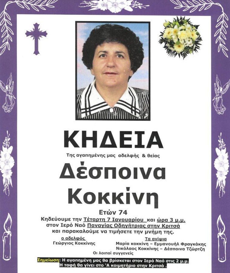Θλίψη επικρατεί στην Κριτσά Λασιθίου, για τον θάνατο της Δέσποινας Κοκκίνη, η οποία έφυγε από τη ζωή σε ηλικία 74 ετών.