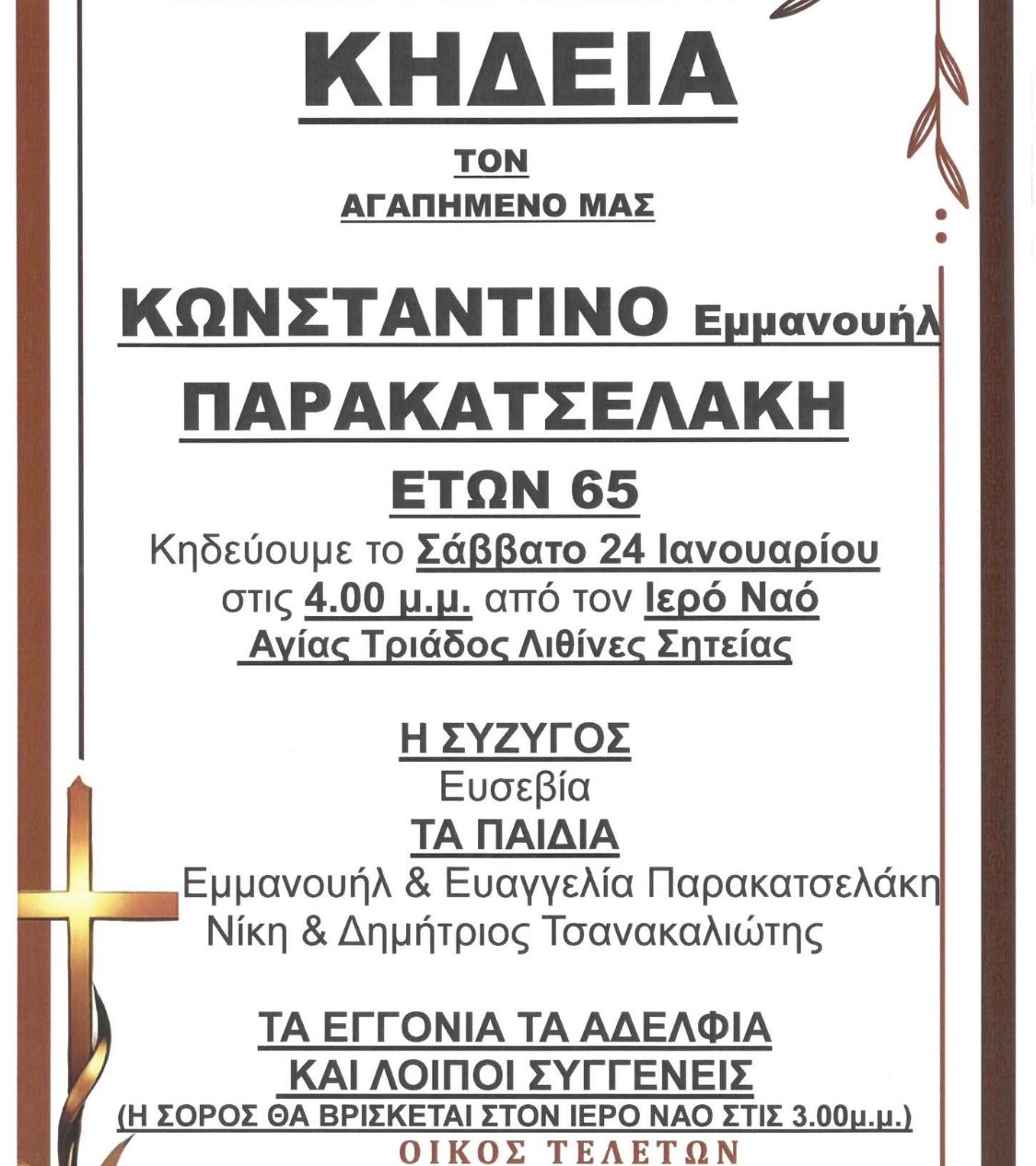 Η κηδεία του αγαπητού Κωνσταντίνου θα γίνει το Σάββατο 24 Ιανουαρίου 2026, στις 4:00 μ.μ., από τον Ιερό Ναό Αγίας Τριάδας στις Λιθίνες Σητείας.