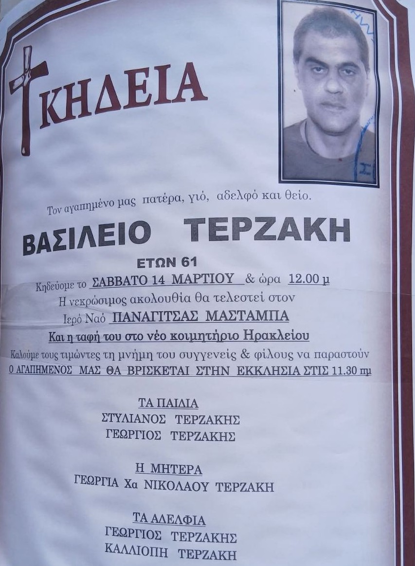 Πένθος επικρατεί στο Ηράκλειο για τον θάνατο του Bασίλη Τερζάκη, ο οποίος έφυγε από τη ζωή στα 61 του χρόνια.