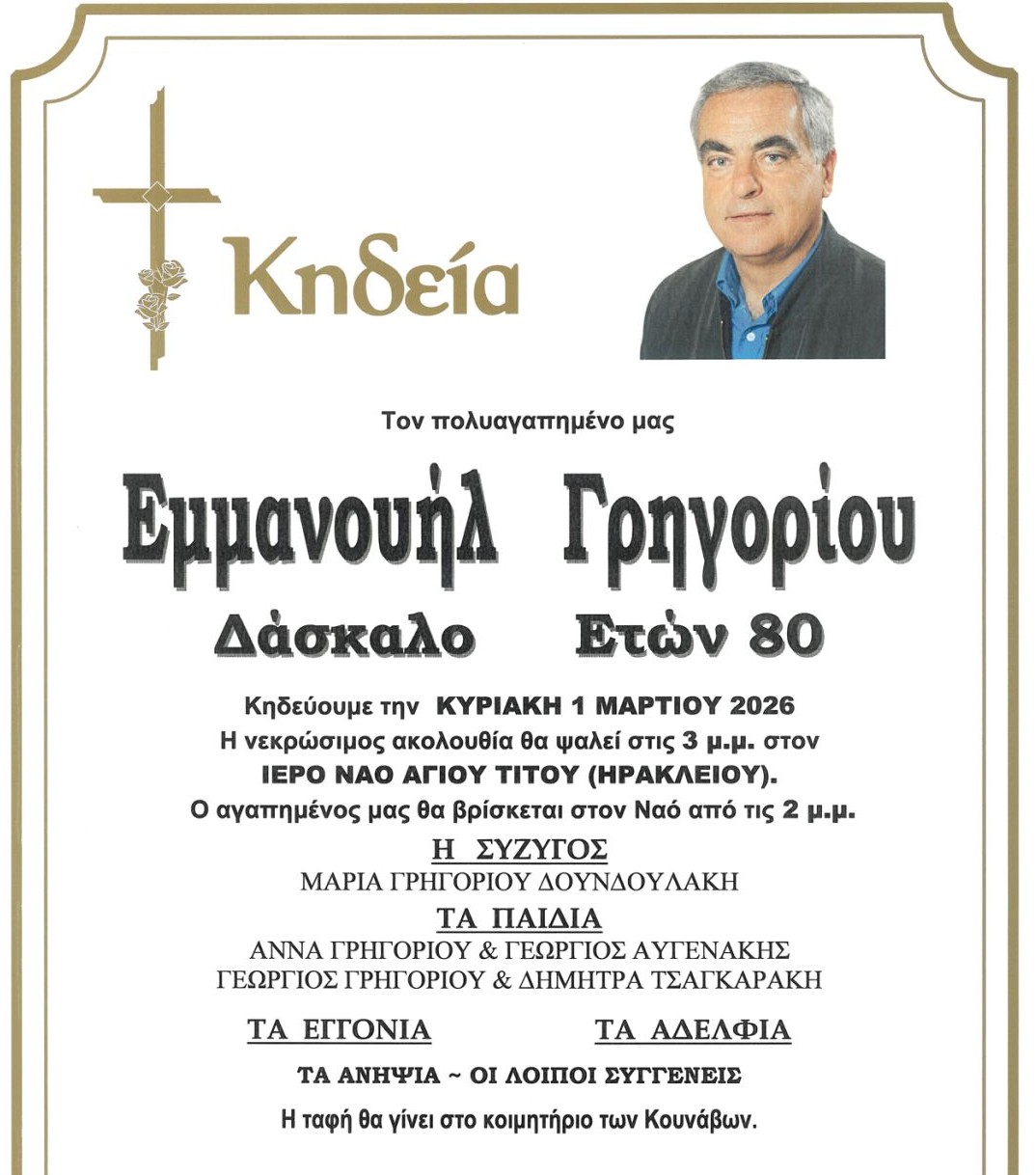 Η κηδεία του θα γίνει αύριο Κυριακή 1/3 στον ιερό ναό του Αγίου Τίτου στις 3 μ.μ.