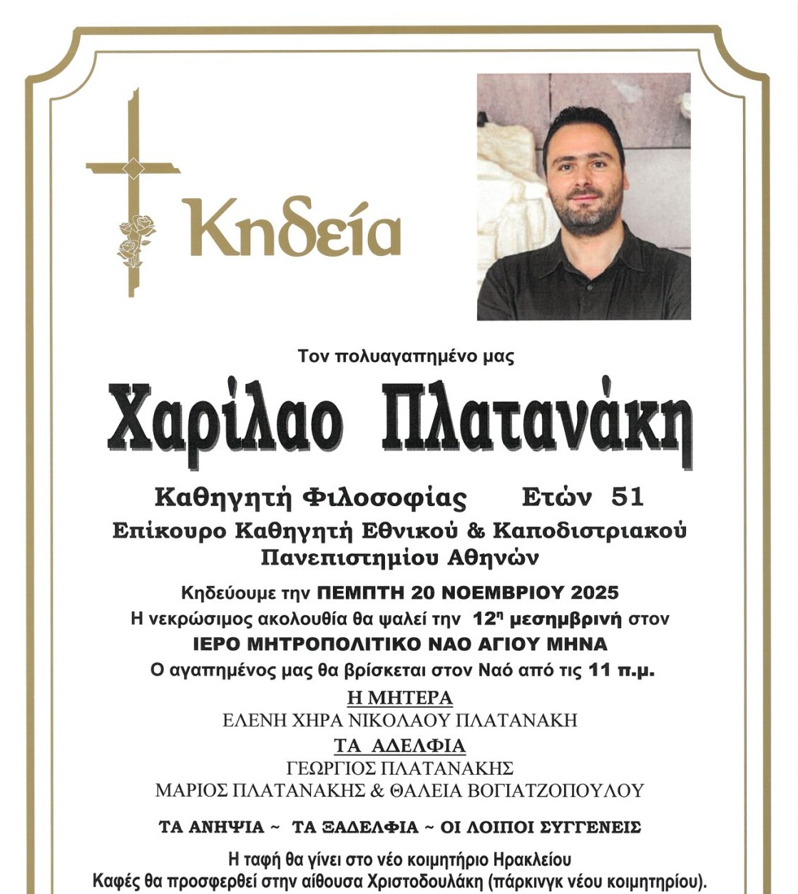 Βαρύ πένθος στο Ηράκλειο για τον θάνατο του γνωστού ακαδημαϊκού καθηγητή Χαρίλαου Πλατανάκη, σε ηλικία μόλις 51 ετών.