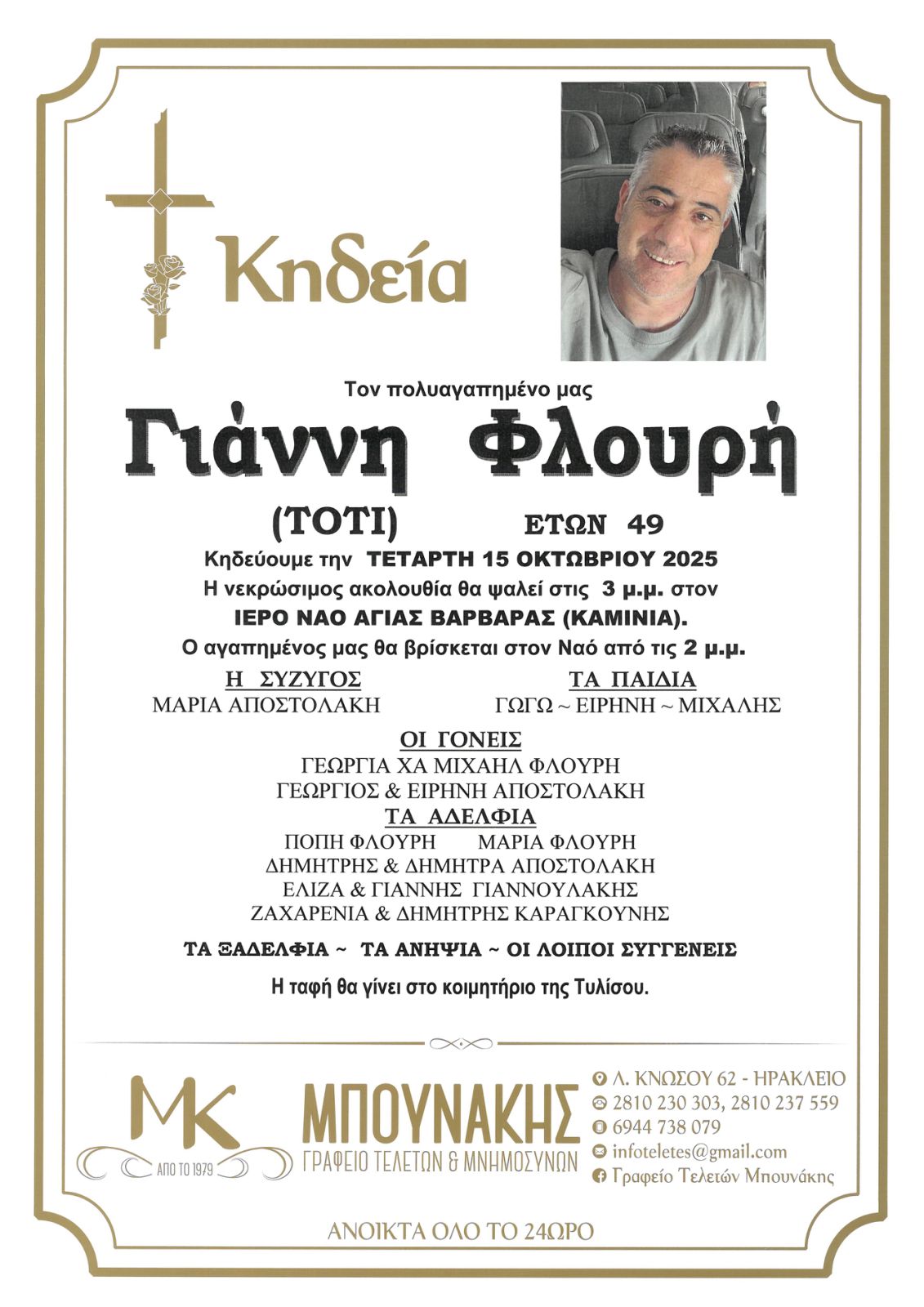 Θλίψη στο Ηράκλειο Κρήτης για την απώλεια του 49χρονου Γιάννη Φλουρή.