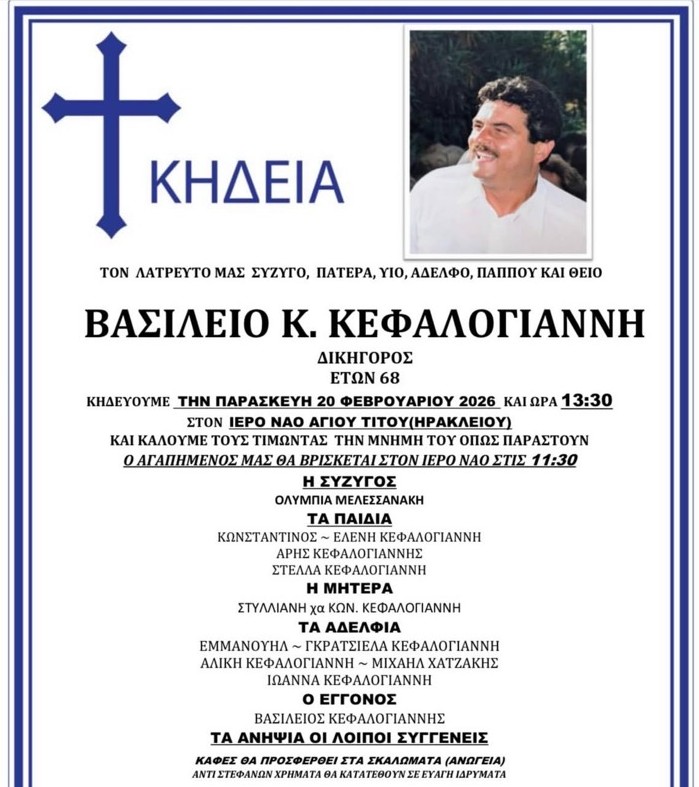 Η κηδεία του Βασίλη Κεφαλογιάννη θα τελεστεί την Παρασκευή 20 Φεβρουαρίου, στις 13:30, στον Καθεδρικό Ναό του Αγίου Τίτου στο Ηράκλειο.