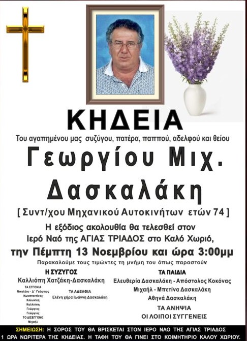 - Ο Γεώργιος Δασκαλάκης απεβίωσε σε ηλικία 74 ετών, σκορπίζοντας θλίψη στο Καλό Χωριό.