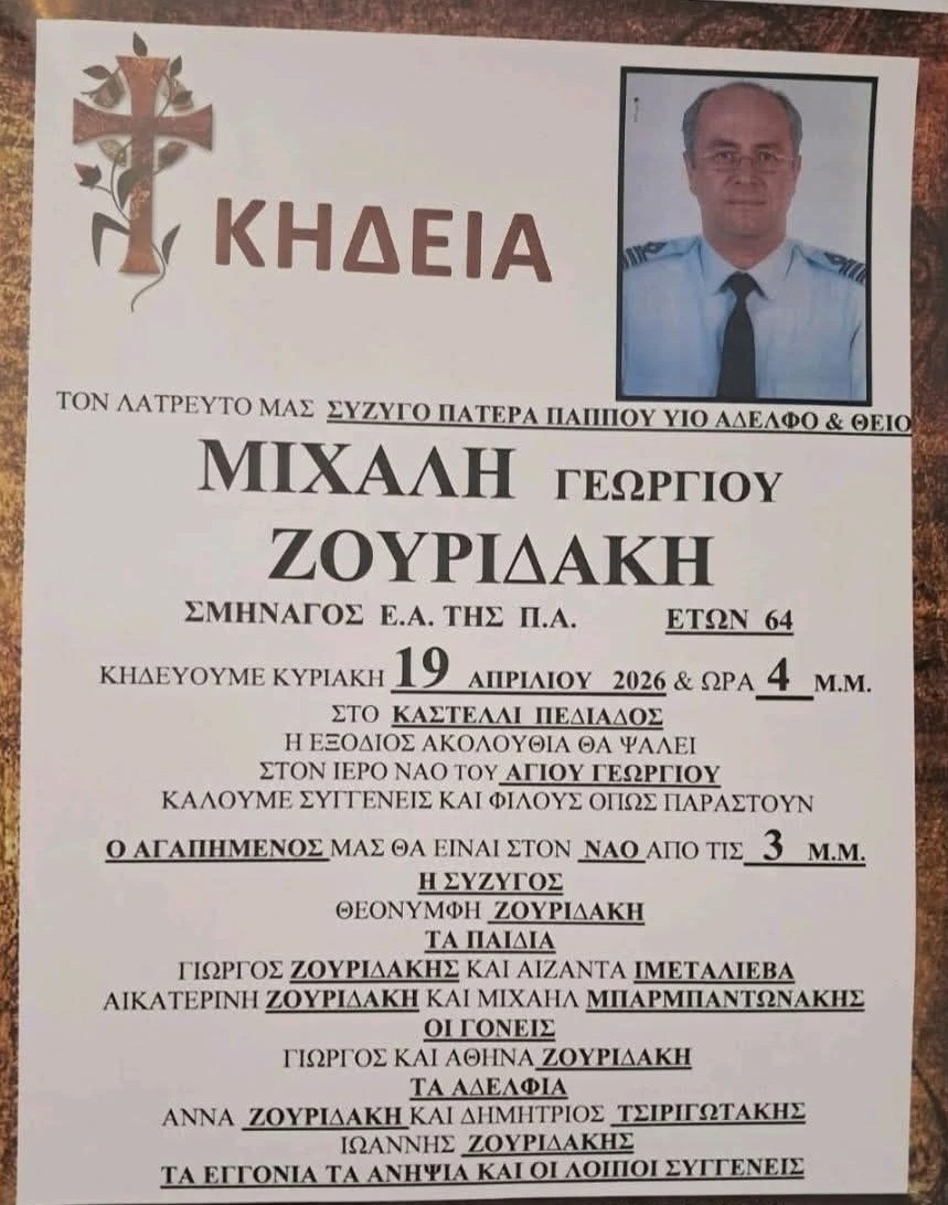 Θλίψη επικρατεί στο Καστέλι Πεδιάδας για τον θάνατο του σμηναγού Μιχάλη Ζουριδάκη, ο οποίος έφυγε από τη ζωή στα 64 του χρόνια.