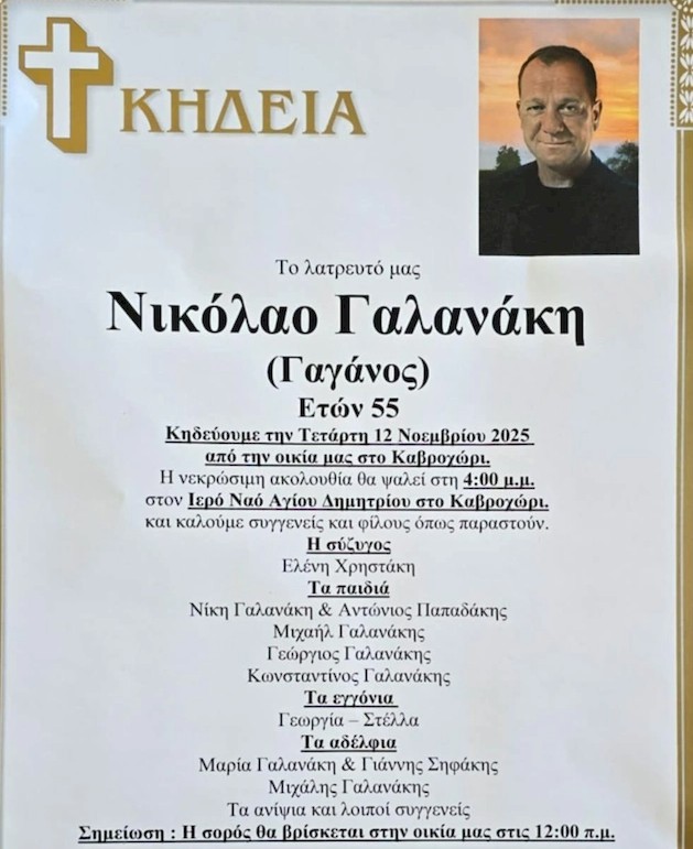 Θλίψη και οδύνη σκόρπισε η είδηση του θανάτου του Νικολάου Γαλανάκη (Γαγάνου), που έφυγε από τη ζωή σε ηλικία 55 ετών.