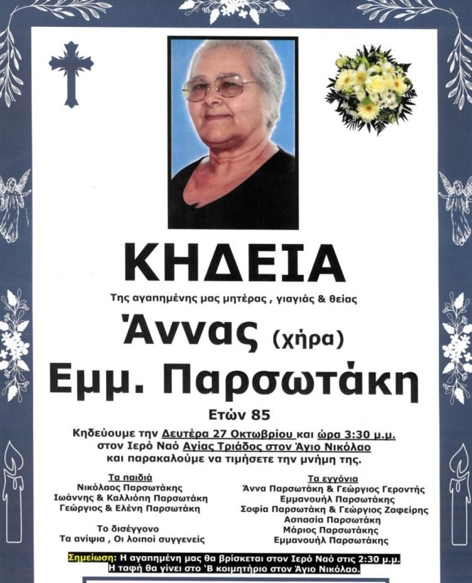 Θλίψη σκόρπισε στην τοπική κοινωνία του Αγίου Νικολάου η είδηση του θανάτου της Άννας Παρσωτάκη, η οποία έφυγε από τη ζωή σε ηλικία 85 ετών.