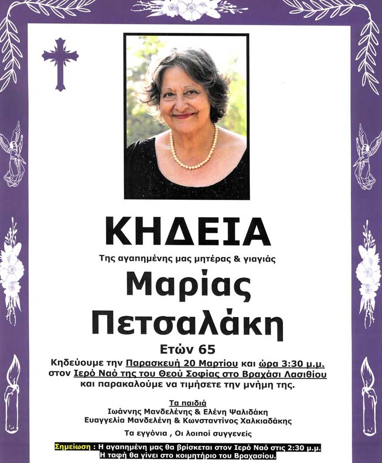 - Θλίψη επικρατεί στο Βραχάσι Λασιθίου για τον θάνατο της Μαρίας Πετσαλάκη σε ηλικία 65 χρόνων.