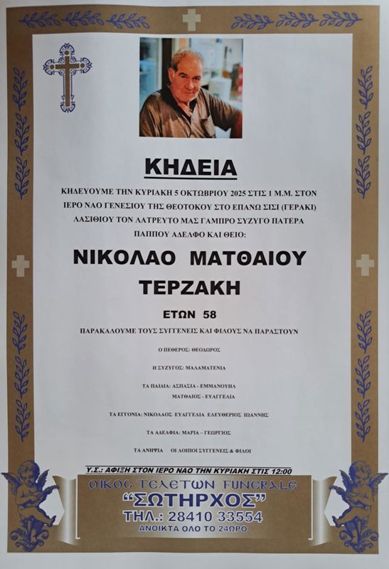 Η κηδεία του θα τελεστεί αύριο, Κυριακή 5/10, στη 1:00 μ.μ., στον Ιερό Ναό Γενεσίου της Θεοτόκου στο επάνω Σίσι.