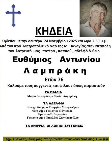 Θλίψη και οδύνη στο Λασίθι σκόρπισε η είδηση του θανάτου του Ευθυμιου Αντωνίου Λαμπράκη, ο οποίος έφυγε σε ηλικία 76 ετών.
