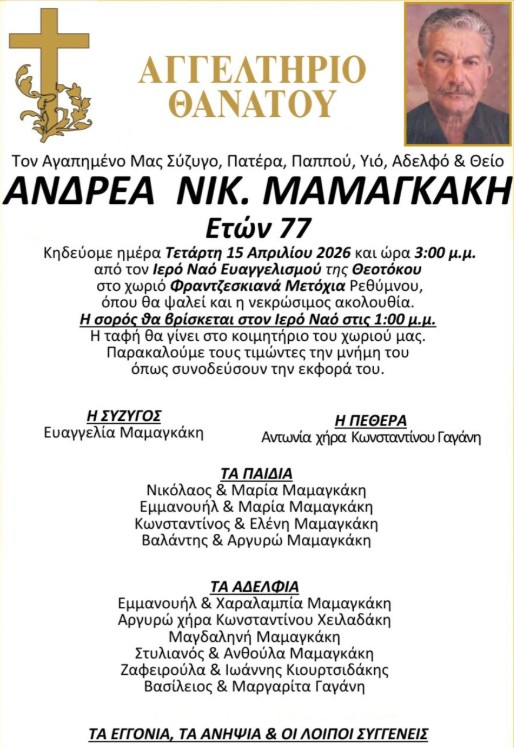 - Η τοπική κοινωνία του Ρεθύμνου πενθεί για τον χαμό του Ανδρέα Μαμαγκάκη, 77 ετών.