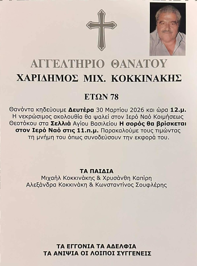 Η κηδεία θα πραγματοποιηθεί σήμερα, Δευτέρα 30 Μαρτίου στις 12:00, στον Ιερό Ναό Κοιμήσεως Θεοτόκου στα Σελλιά του Αγίου Βασιλείου.