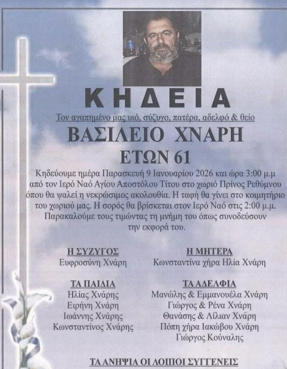 - Η τοπική κοινωνία του Πρίνου Ρεθύμνου θρηνεί τον θάνατο του Βασιλείου Χνάρη στα 61 του χρόνια.