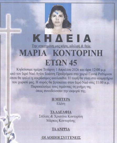 Η κηδεία της εκλιπούσας θα τελεστεί αύριο Τετάρτη 1 Απριλίου 2026 στις 12:00 στον Ιερό Ναό Αγίου Ιωάννη Προδρόμου στο χωριό Γωνιά Ρεθύμνου.