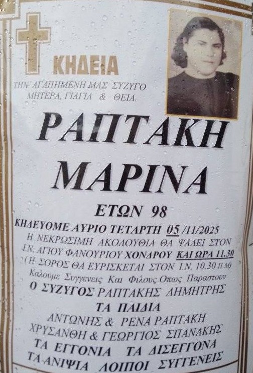 Σε ηλικία 98 ετών εγκατέλειψε τα εγκόσμια η Μαρίνα Ραπτάκη από τον Χόνδρο Βιάννου.