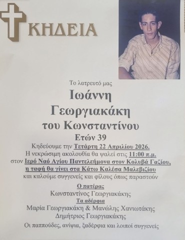 Η νεκρώσιμη ακολουθία θα ψαλεί αύριο Τετάρτη 22 Απριλίου 2026 στις 11πμ στον Ιερό Ναό Αγίου Παντελεήμονα στον Κολυβά Γαζίου.