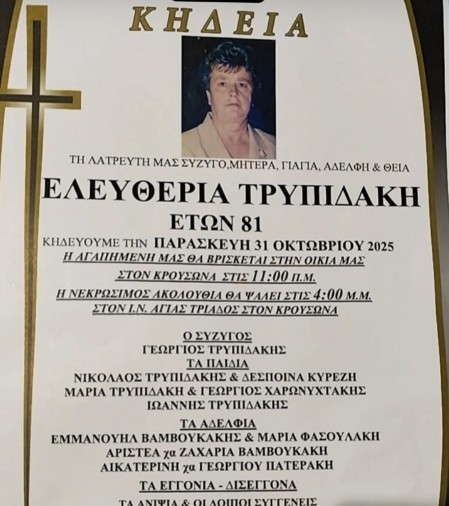 - Βαρύ πένθος επικρατεί στον Κρουσώνα για το θάνατο της Ελευθερίας Τρυπιδάκη σε ηλικία 81 ετών.