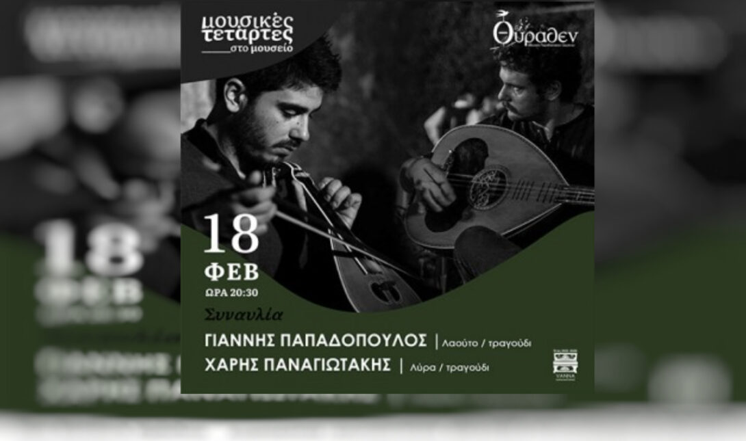 Μια ιδιαίτερη μουσική σύμπραξη παρουσιάζουν ο Χάρης Παναγιωτάκης στη λύρα και ο Γιάννης Παπαδόπουλος στο λαούτο, με ένα αφιέρωμα στις μουσικές καταγραφές της κρητικής παράδοσης.