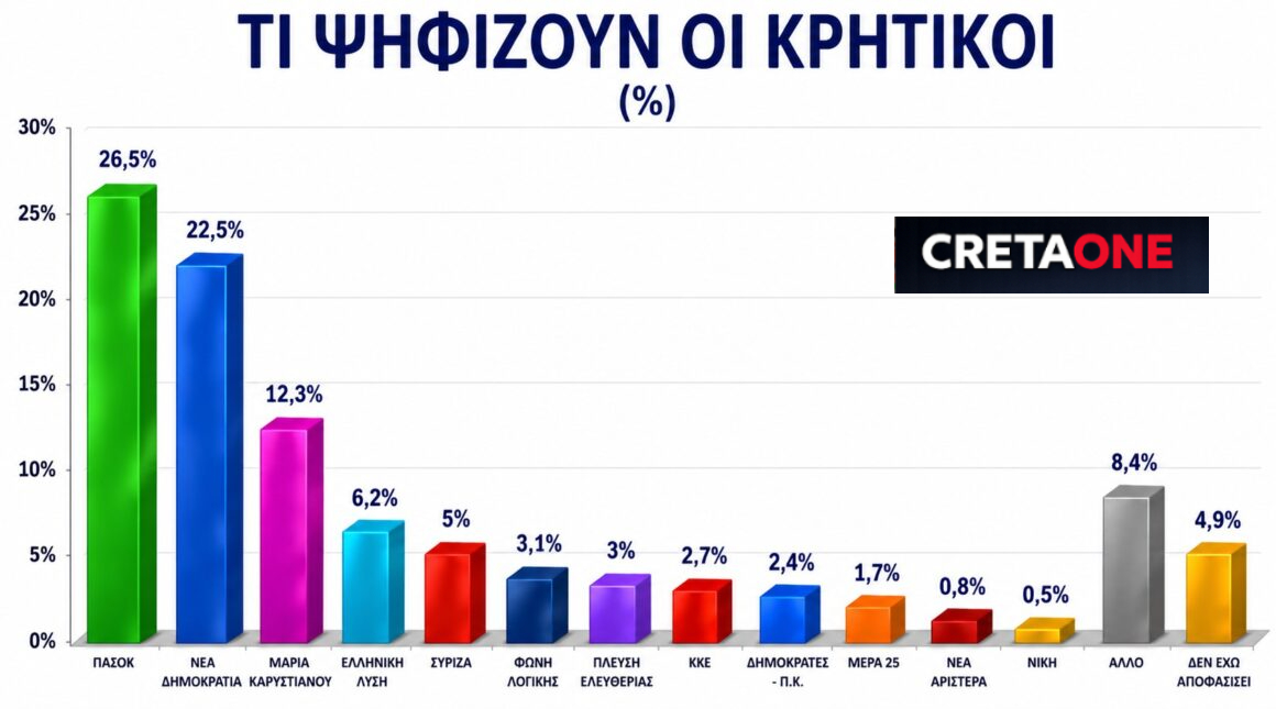 - Το ΠΑΣΟΚ καταλαμβάνει την πρώτη θέση στις προτιμήσεις των Κρητικών με 26,5%, αφήνοντας πίσω τη Νέα Δημοκρατία με 22,5%.