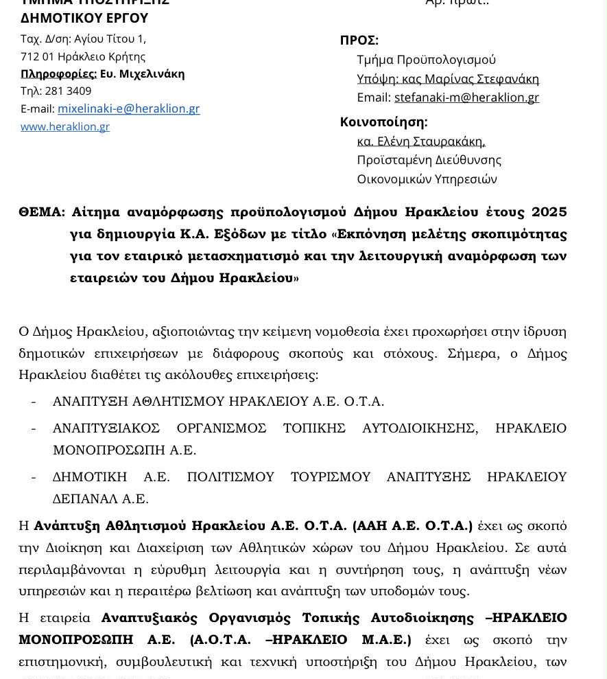 «Αίτημα αναμόρφωσης προϋπολογισμού δήμου Ηρακλείου έτους 2025 για τη δημιουργία Κ.Α εξόδων με τίτλο εκπόνηση μελέτης σκοπιμότητας για τον εταιρικό μετασχηματισμό και την λειτουργική αναμόρφωση των εταιρειών του δήμου Ηρακλείου».
