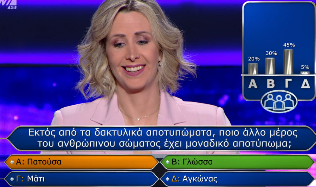 - Η ερώτηση αφορούσε ποιο μέρος του ανθρώπινου σώματος έχει μοναδικό αποτύπωμα εκτός από τα δακτυλικά αποτυπώματα.