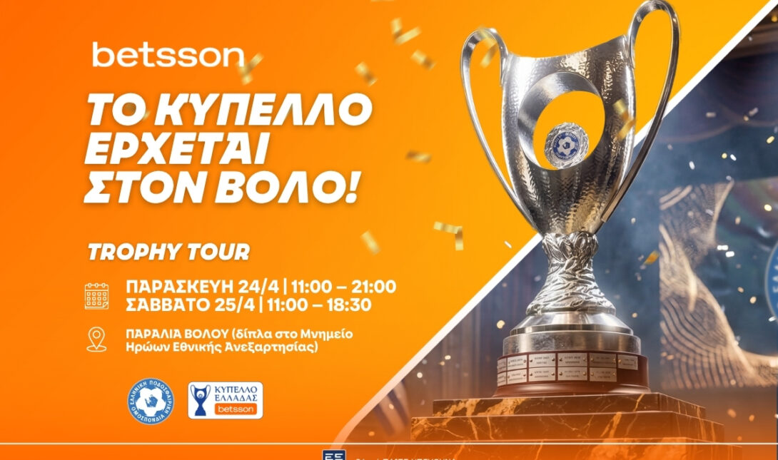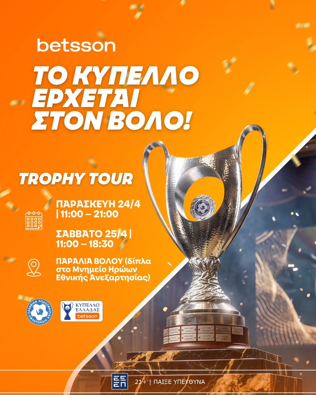 Το Betsson Trophy Tour ολοκληρώνει το φετινό του ταξίδι και κάνει την τελευταία του στάση στον Βόλο, την Παρασκευή 24 και το Σάββατο 25 Απριλίου, λίγες ώρες πριν από τον μεγάλο τελικό του Κυπέλλου Ελλάδας Betsson, ανάμεσα στον ΠΑΟΚ και τον ΟΦΗ, ο οποίος θα διεξαχθεί το Σάββατο 25 Απριλίου.